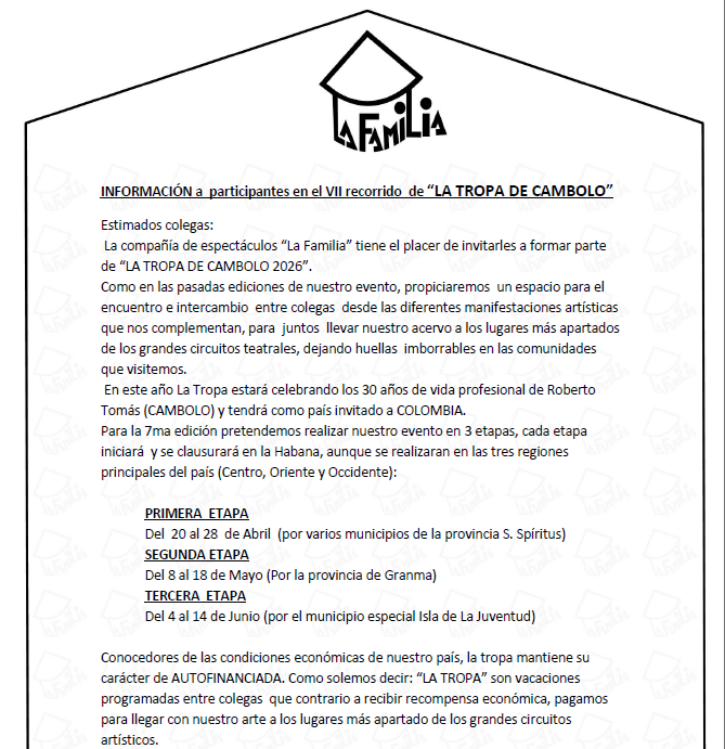 A meno che le condizioni logistiche e politche non diventino proibitive a causa dell'assedio e del blocco a cui Cuba è sottoposta in questi mesi più che mai, anche quest'anno 2026 ci sarà un contributo in presenza al teatro comunitario della Tropa de Cambolo.